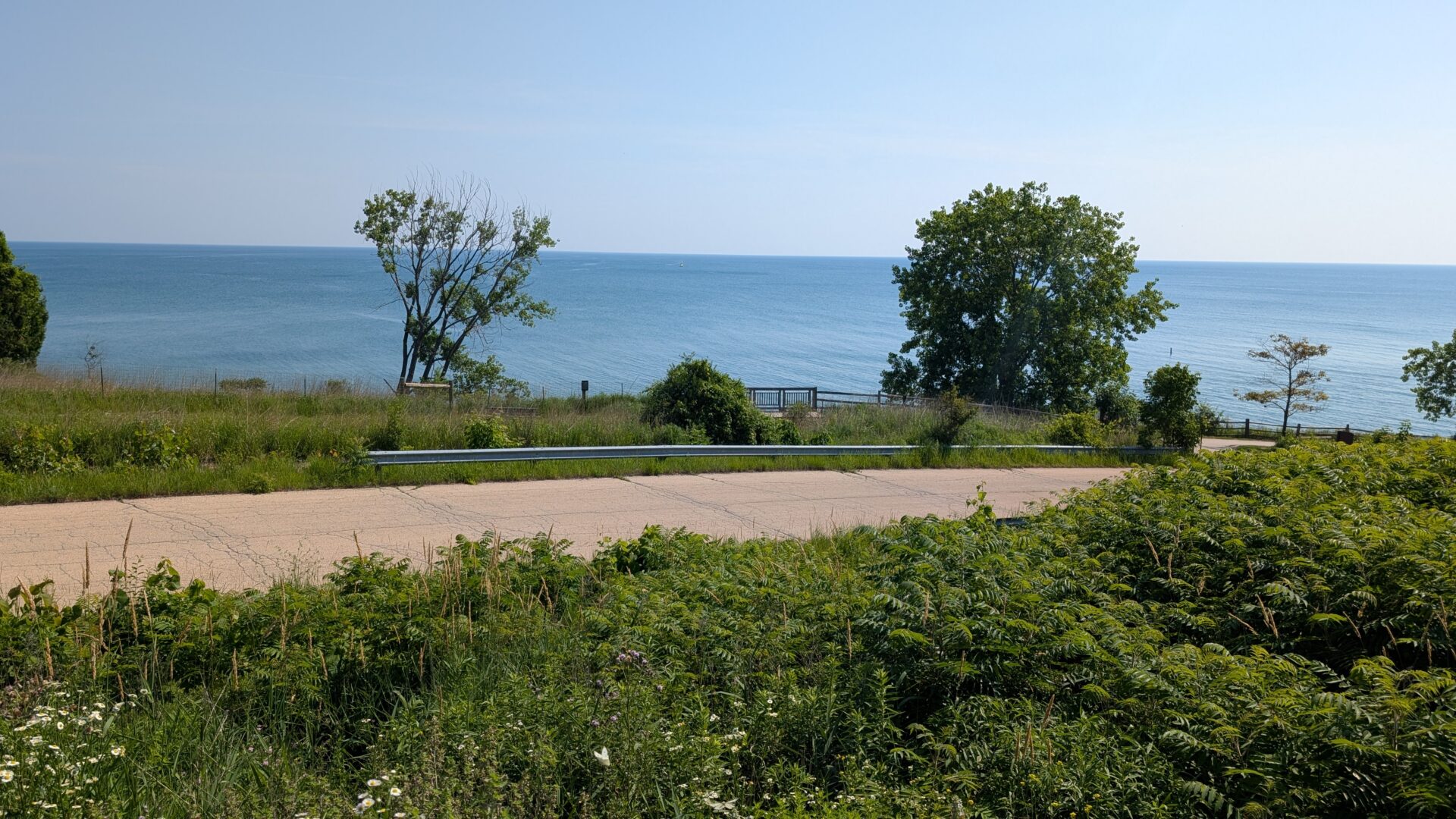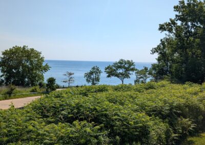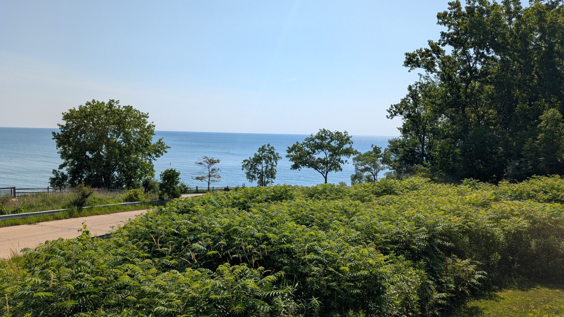 The trail climbs from the ravine and opens onto the Lake Michigan blufftop, and this is where the morning earns its keep. The lake appears through the trees with the flat, expansive quality it always carries from the Illinois shore — horizon to horizon, a blue that shifts with the sky, and that particular Great Lakes stillness that makes it feel more like a sea than a lake.
